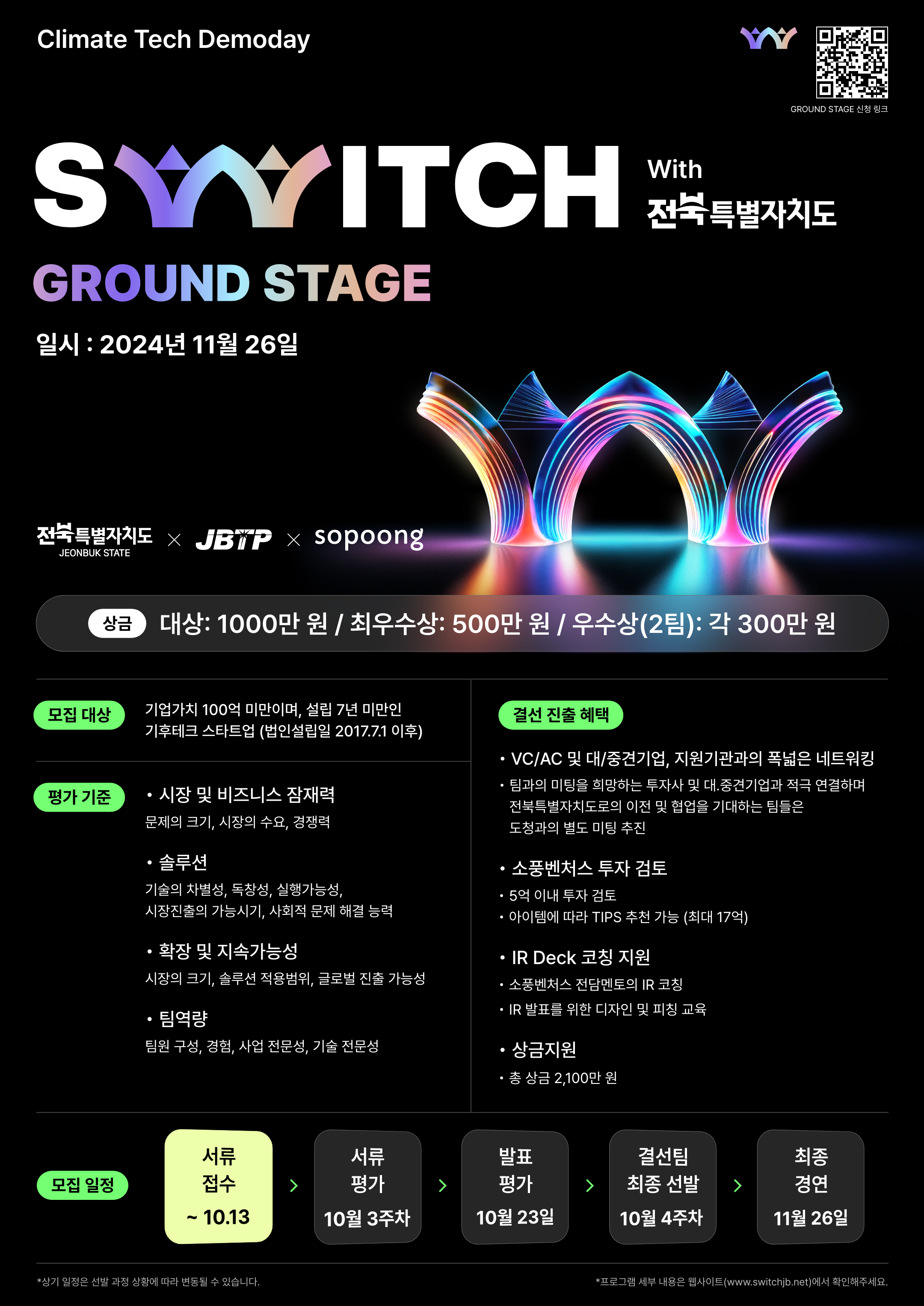기후테크 특화지역 전북특별자치도와 전북테크노파크, 소풍벤처스에서 기후테크 데모데이 SWITCH- GROUND STAGE를 개최합니다.