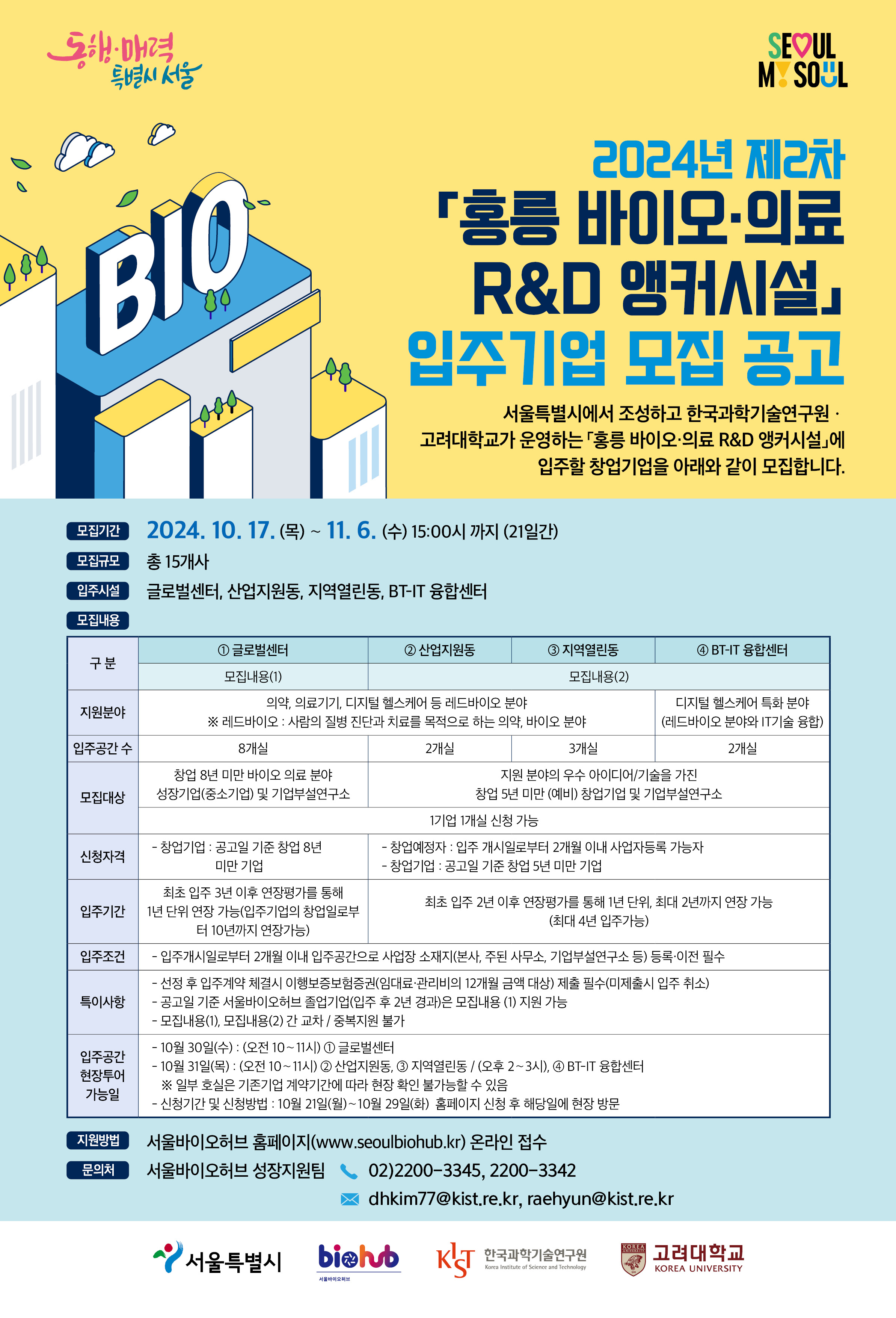 서울특별시에서 조성하고 한국과학기술연구원ㆍ고려대학교가 운영하는 「홍릉 바이오·의료 R&D 앵커시설」에 입주할 창업기업을 아래와 같이 모집하오니 많은 관심 부탁드립니다.