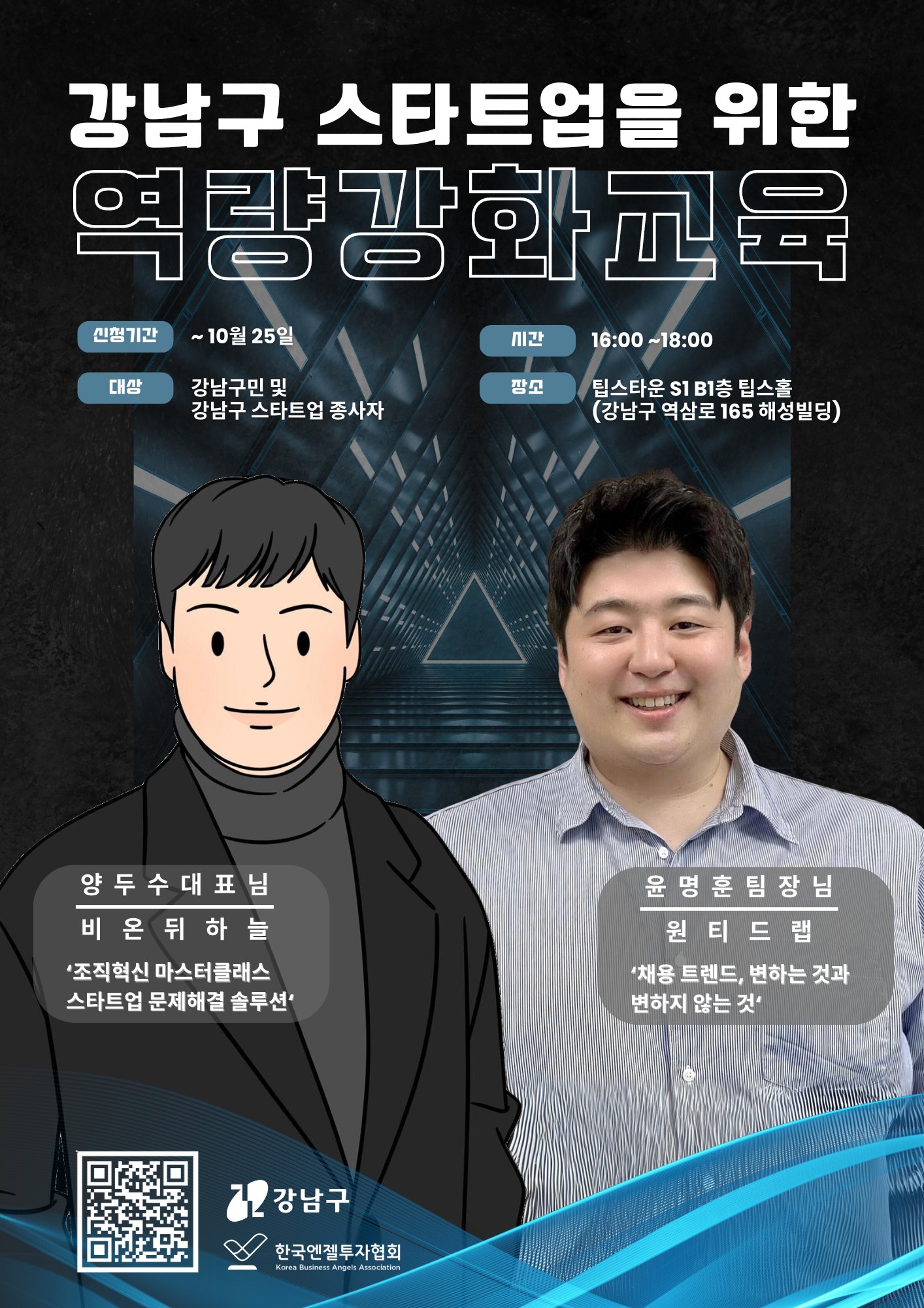 안녕하세요! 한국엔젤투자협회입니다. <2024 강남구 미래산업 취창업 아카데미> 10월 교육을 진행합니다! 스타트업에 종사하시나요? 혹시 문제해결을 위한 컨설팅이 필요하신가요? 솔루션을 알려줄 마스터클래스! 비온뒤 하늘 양두수 대표님의 강연! 변화하는 채용 트렌드를 이해하고, 효과적인 채용 및 리텐션 전략을 통해 성장할 수 있는 조직 기반 HR 마스터가 알려주는 원티트랩 윤명훈 팀장님의 강연! 강남구민 및 강남구 소재 스타트업은 누구나 지원 가능하며 여러분들의 역량강화를 위해 관심있는 분들의 많은 참여 바랍니다. * 강남구 지역이 아니신 분들께서는 담당자 메일로 신청 요청 부탁드립니다! !